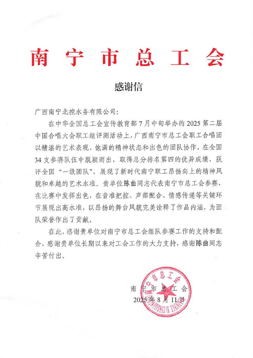 廣西南寧北控水務(wù)有限公司獲南寧市總工會(huì)致信表?yè)P(yáng)2025-08-25